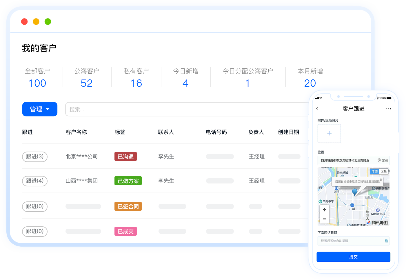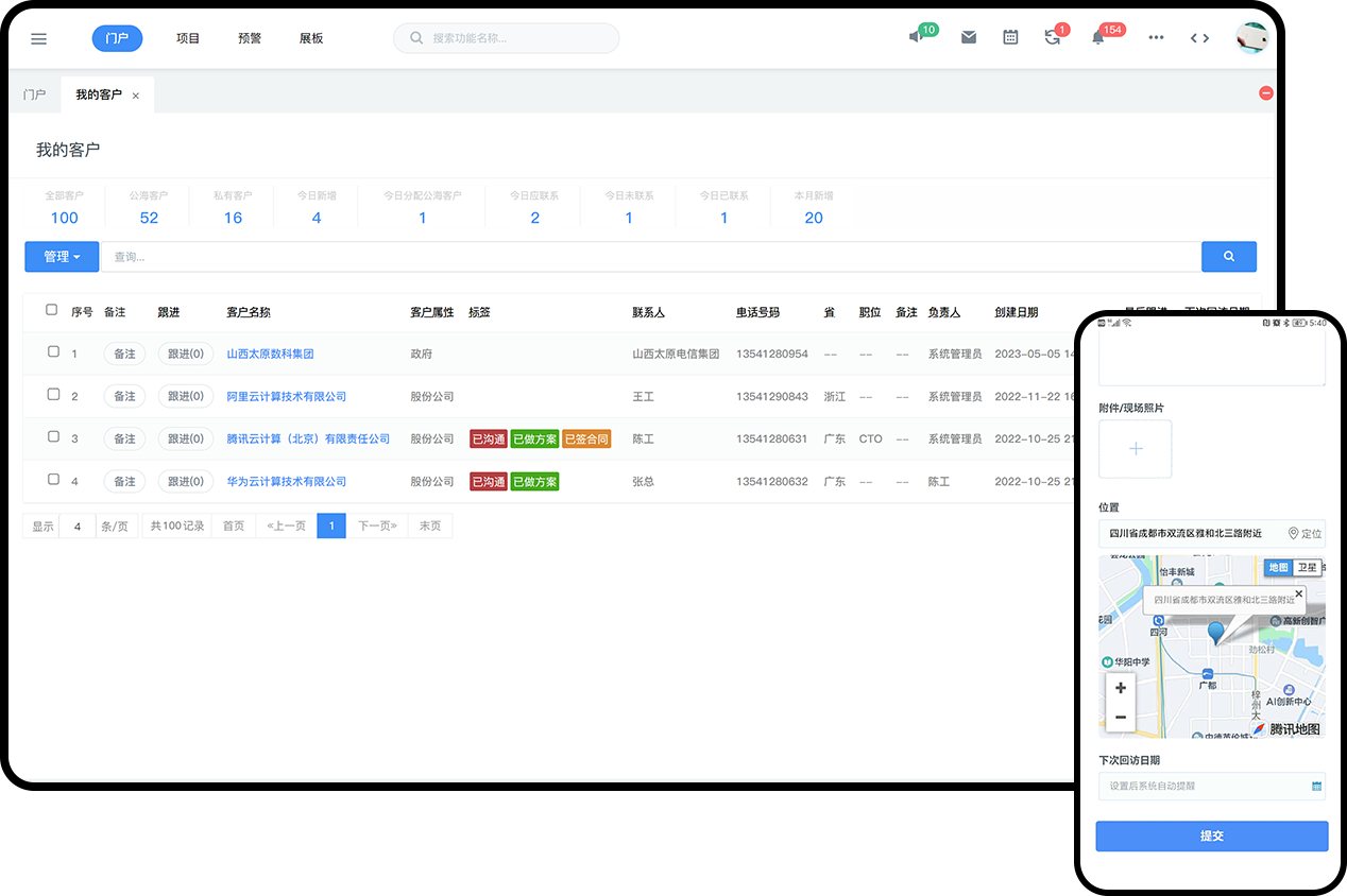 客户跟进、激活、成交、售后全周期可视化管理,智能呈现360度客户画像。支持手机端填写跟进记录、拍照上传等。