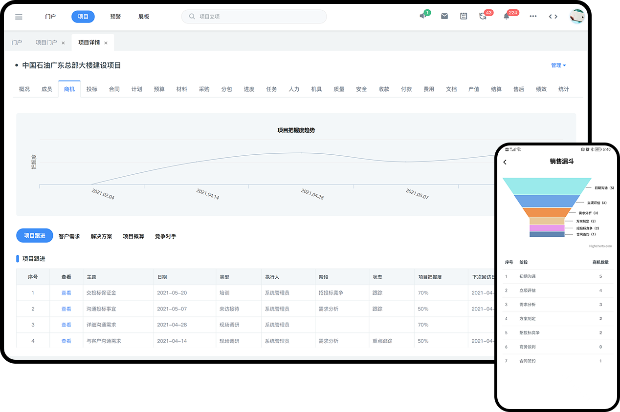 从商机报备、需求沟通到⽅案制作、报价、投标全过程可视化管控。自动生成销售漏斗、支持随时移动端报备等。