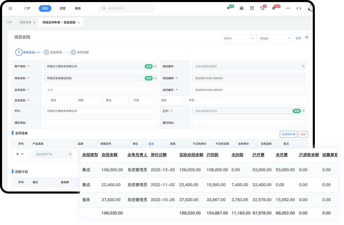 从销售合同发起、审批、归档到变更、统计等全过程数字化管控。自动关联合同清单、回款计划、开票申请、回款记录。