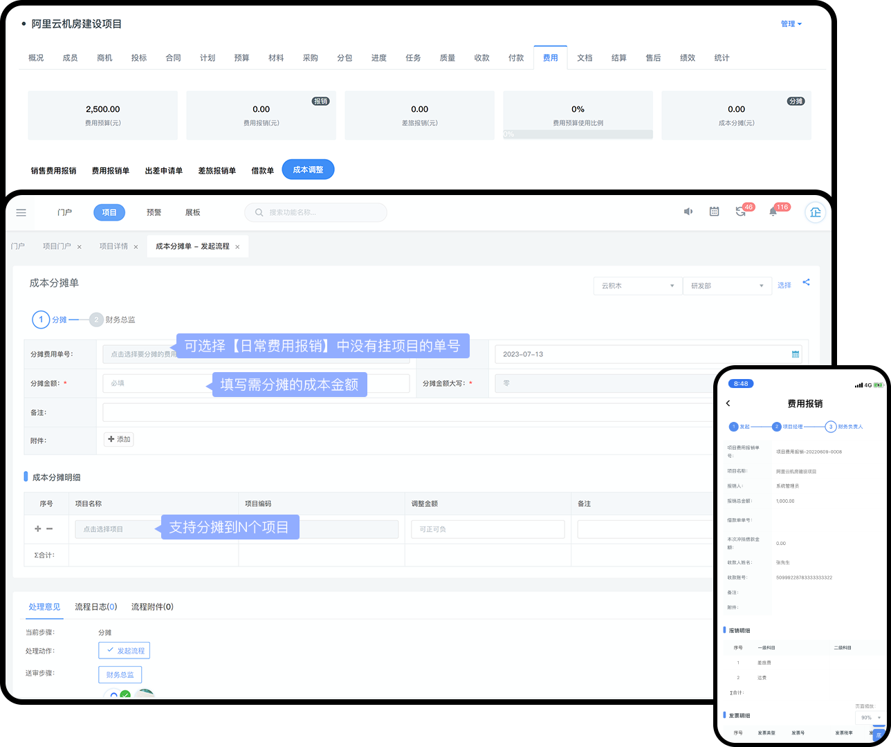 项目费用报销与日常费用报销双线并行,支持批量分摊日常报销费用到N个项目,实现费用成本精准核算管控。