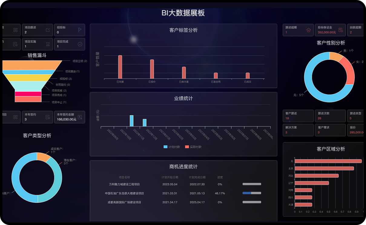 系统内嵌BI报表引擎,可自定义BI展板,直观展现客户管理全周期大数据。