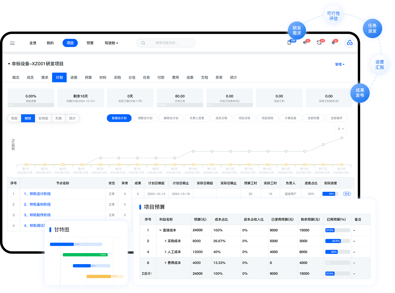 产品研发需求、可行性报告、立项评估、计划编制、进度汇报、预算编制、成本支出、成果发布等产品研发全过程可视化。