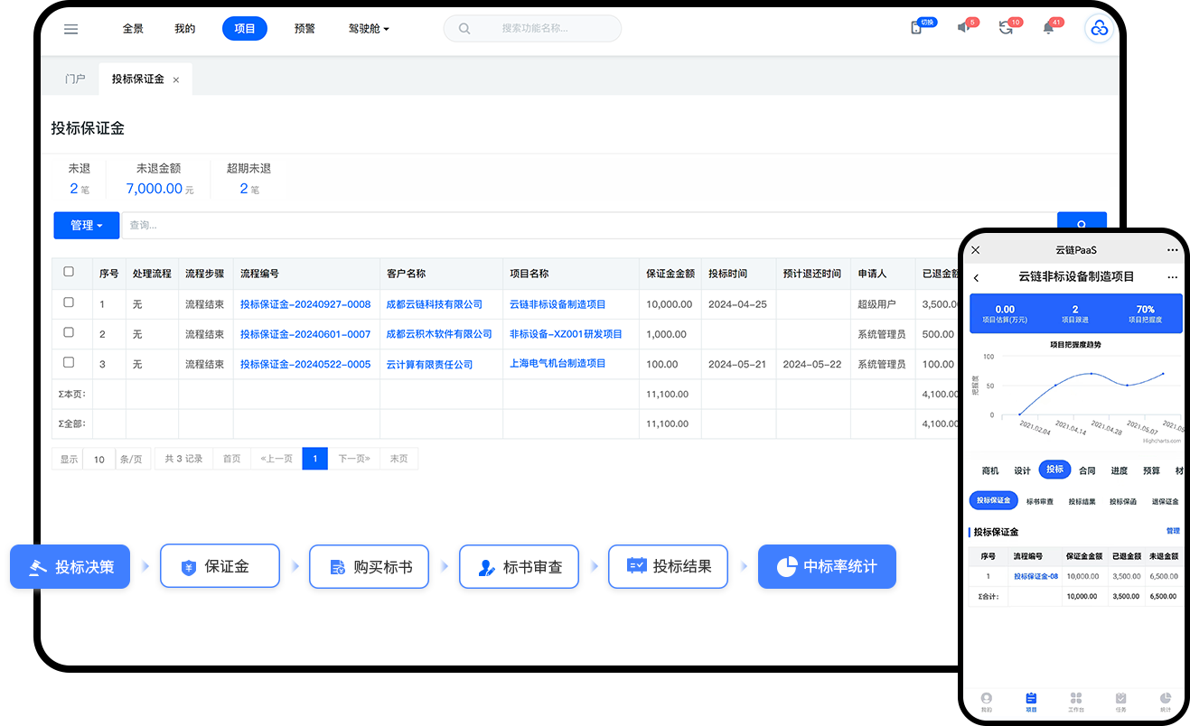 投标决策、保证金(函)管理、标书购买及审查、结果录入等全流程风险管控。智能追踪保证金退款状态,逾期自动预警。