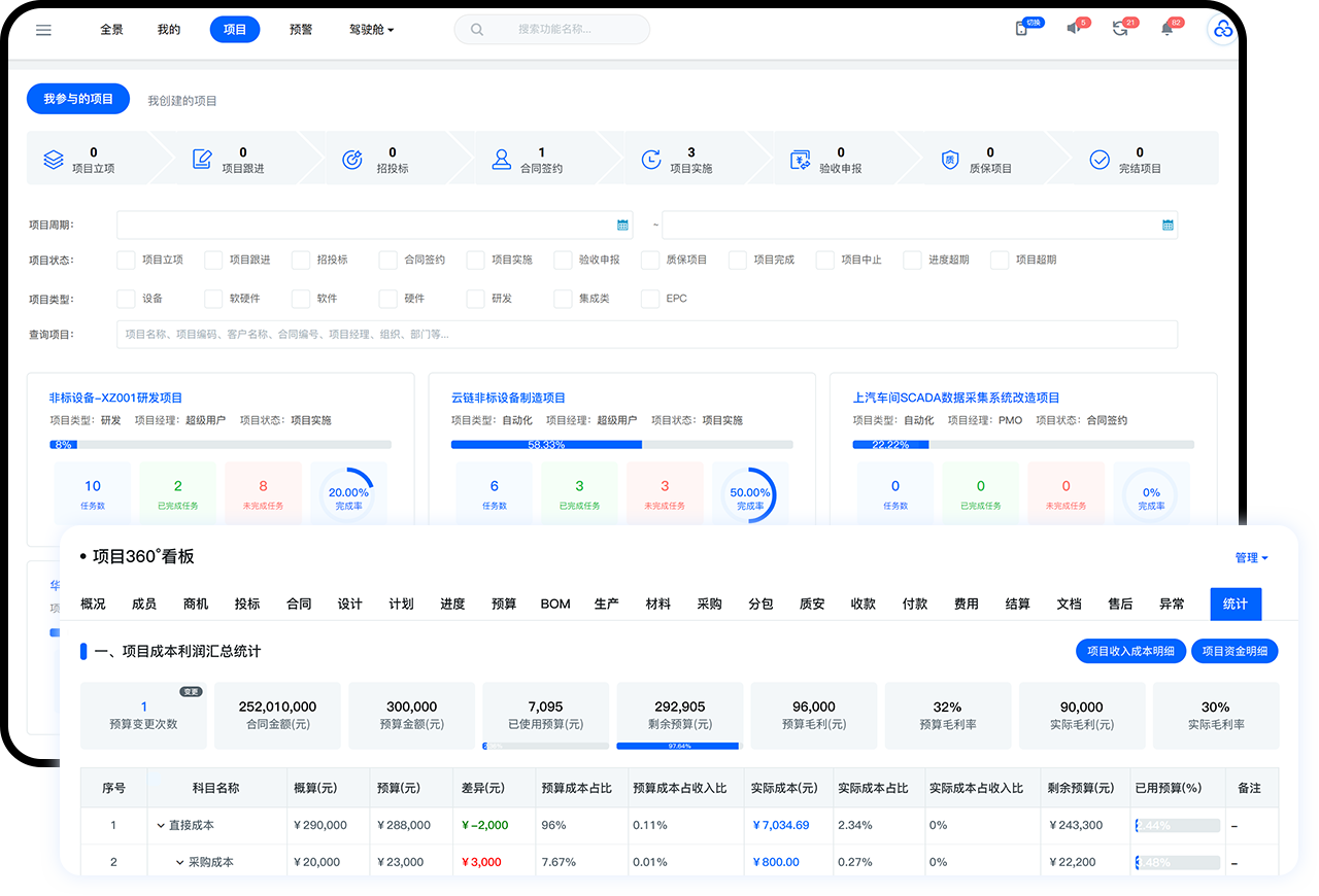 以项目为中心穿透式管控销售、设计、计划、进度、预算、成本、生产、采购、外协、质量、文档、售后、验收、风险等项目全周期。项目全过程进度一目了然,预算成本尽在掌控。