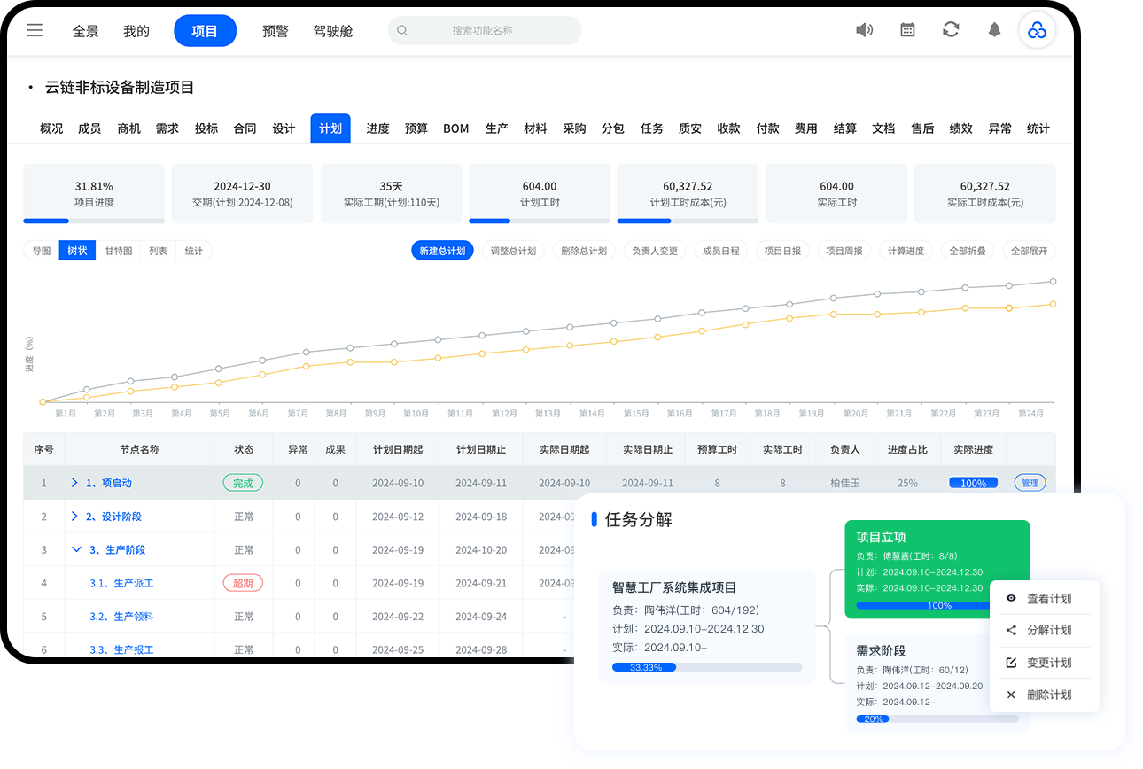 以计划控进度;项目里程碑计划支持无限层级任务拆分及汇报,可视化掌控项目执行及整体进度。自动生成进度甘特图,智能预警进度滞后或超期。