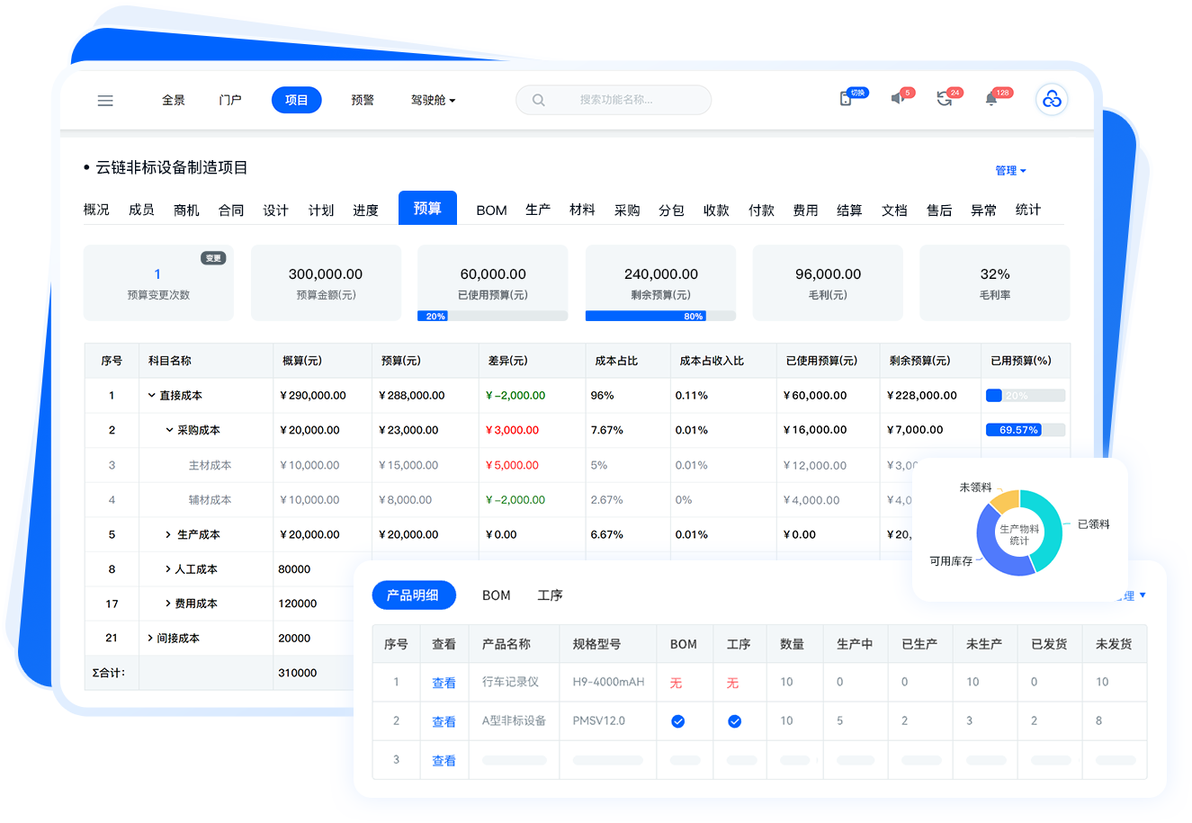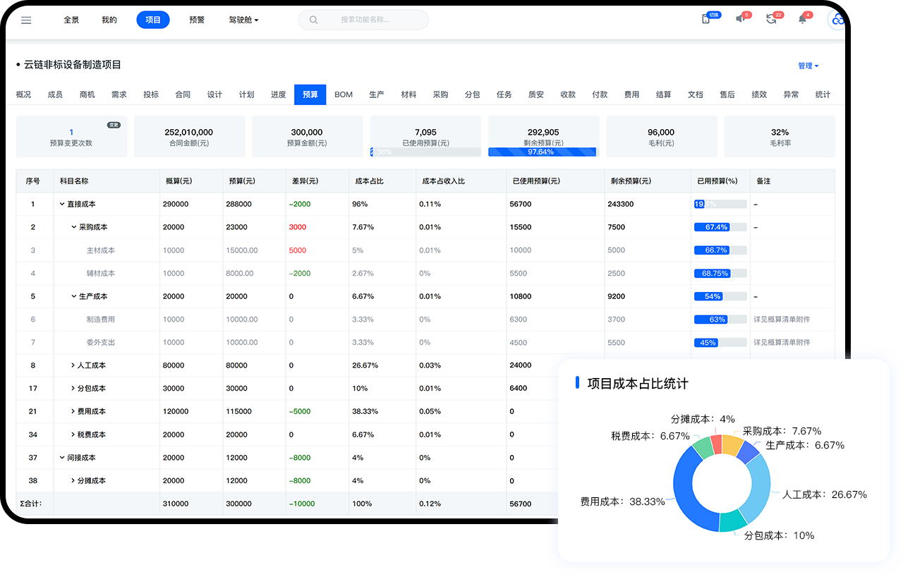以预算控成本;可视化管控项目采购、生产、人工、费用、外协等预算的编制、变更、分析全过程,自动实时核算统计项目成本利润。