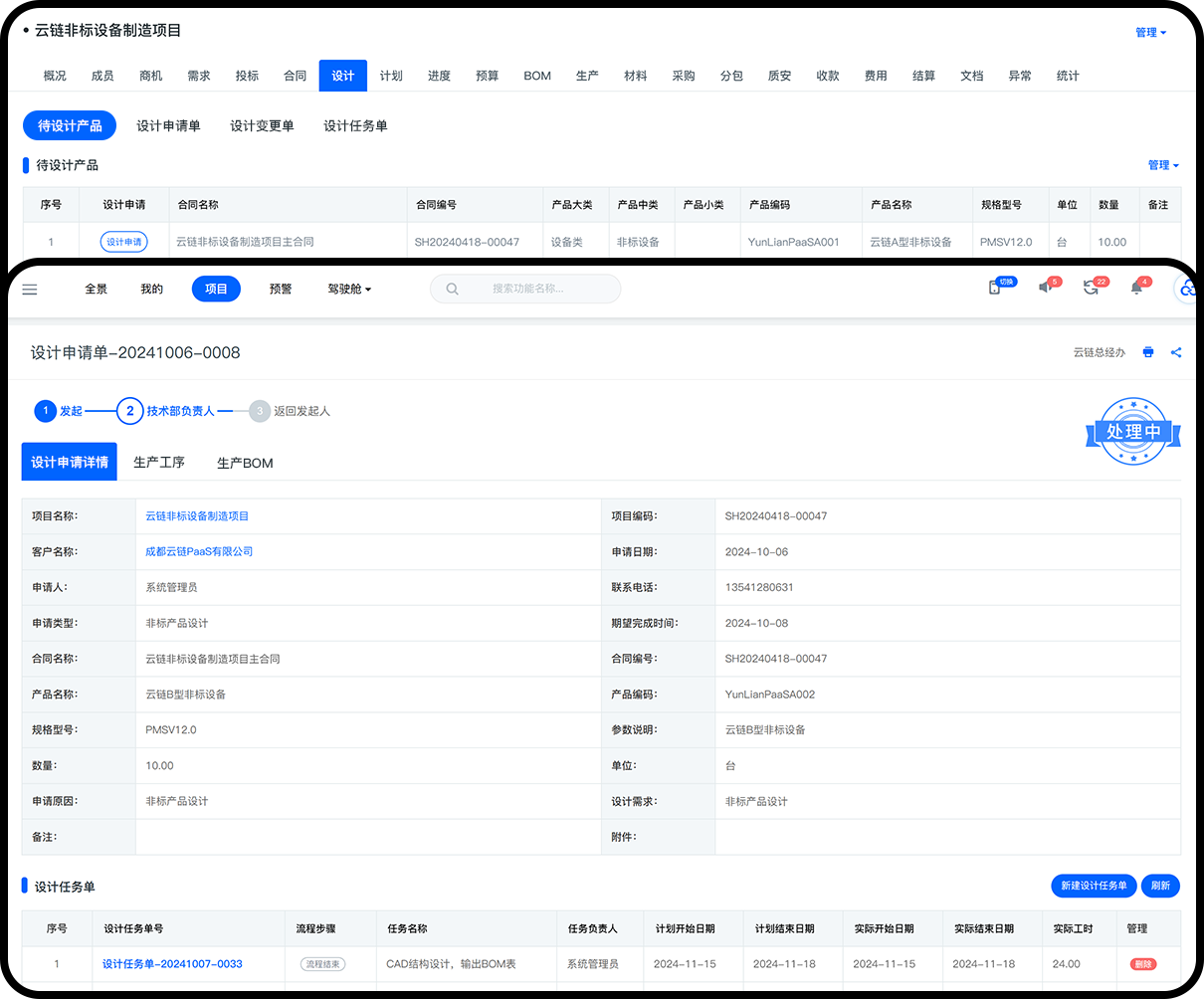 非标品设计申请、任务下达、执行反馈、技术方案生成全流程可视化;非标品合同清单自动生成待设计产品统计,支持一键发起设计申请。