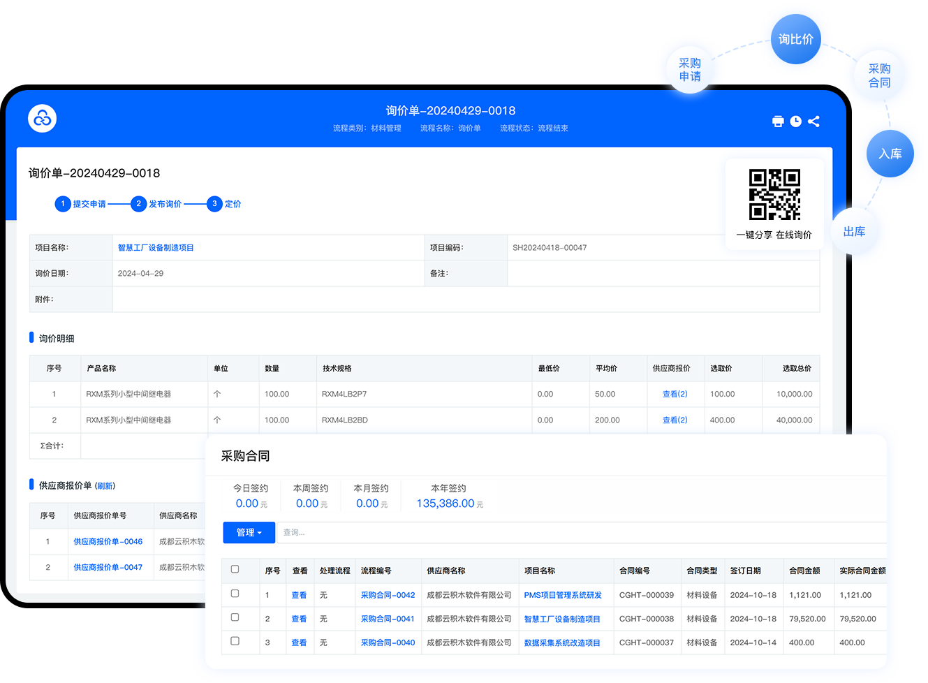 覆盖采购申请、MRP分析、询比价、采购合同、原料入库出库、供应商管理全链条;自动生成询价二维码,支持多家供应商在线报价、系统自动比价。