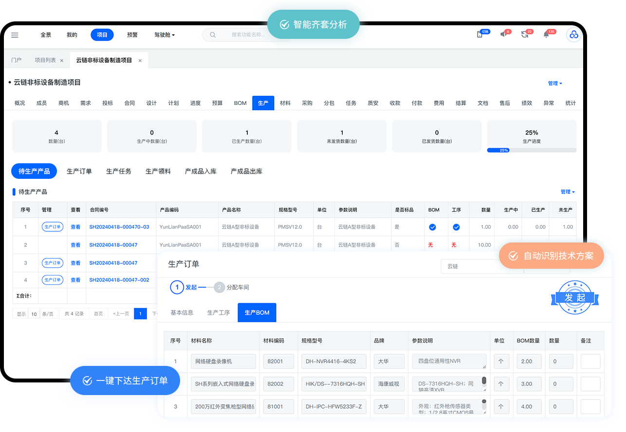 根据项目设计成果BOM表及工序,自动生成项目生产技术方案,支持一键生成智能齐套分析、自动关联项目生产排产派工、领料报工。