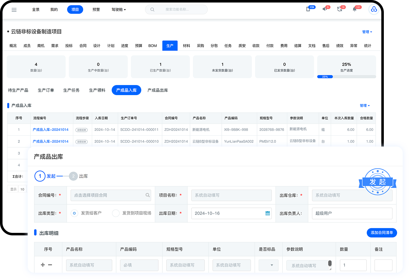 生产成品入库、出库/发货全流程智能化管控,自动追踪发货进度、自动统计已发货、未发货数量;发货后自动生成验收计划