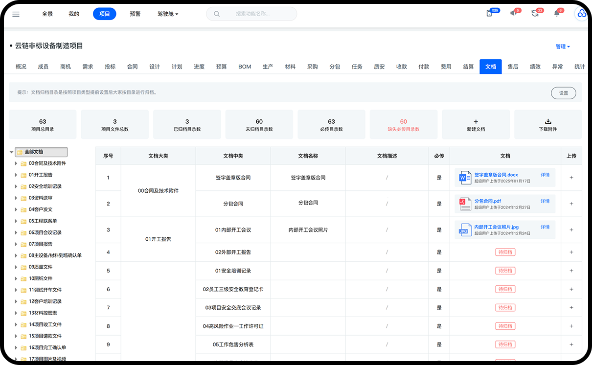 自动归集制造生产项目设计文件、合同等全过程资料,实时⽣成档案状态(归档/缺失)统计。支持自定义归档目录及过程文件源。