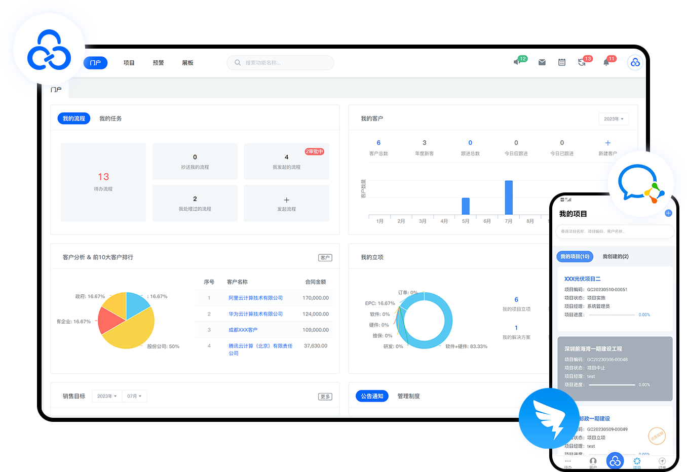 支持PC、移动多端登录,可与钉钉、企业微信无缝集成,随时随地移动办公;也可与CRM、ERP、OA等任意第三⽅系统集成,多维打造一体化管理平台。