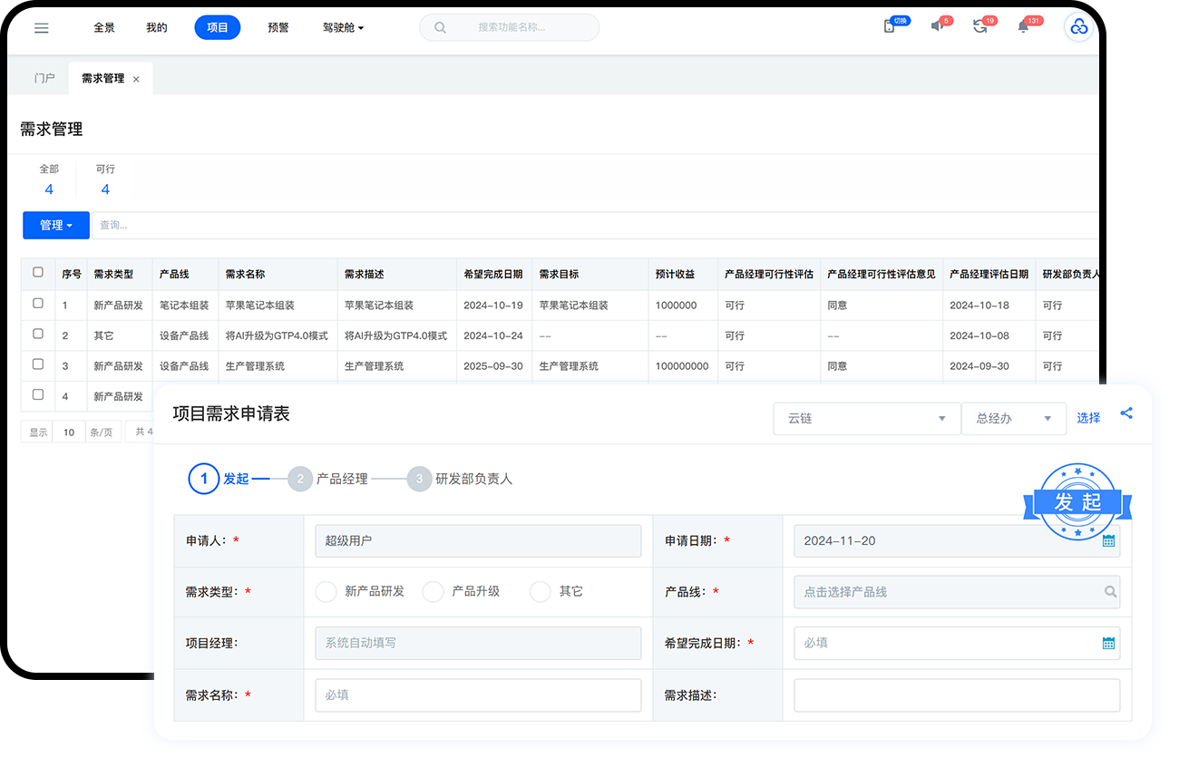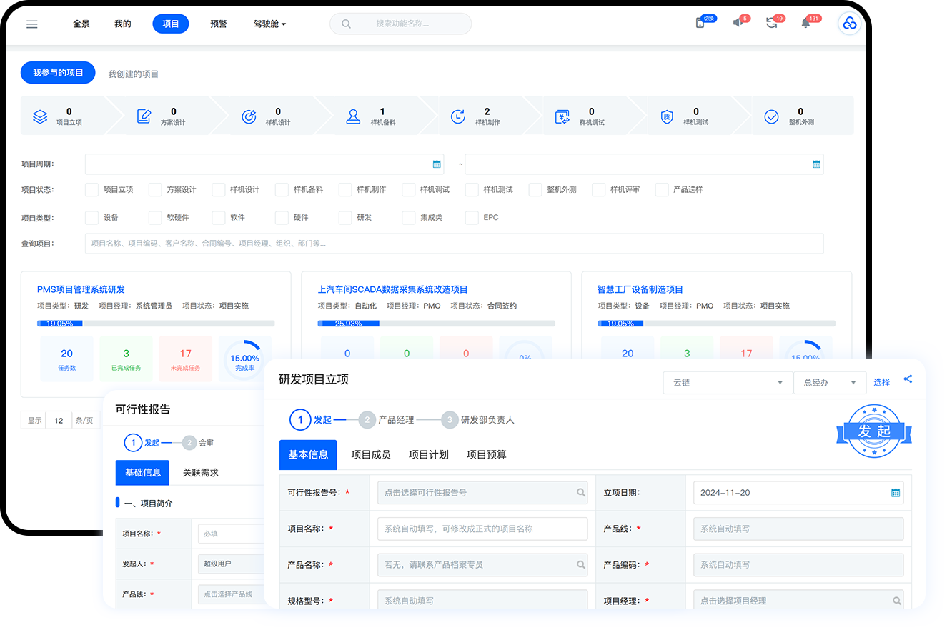 项目立项申请自动关联可行性评估报告,同步组建团队、编制里程碑计划及项目预算,自动同步项目门户、生成项目360°看板。