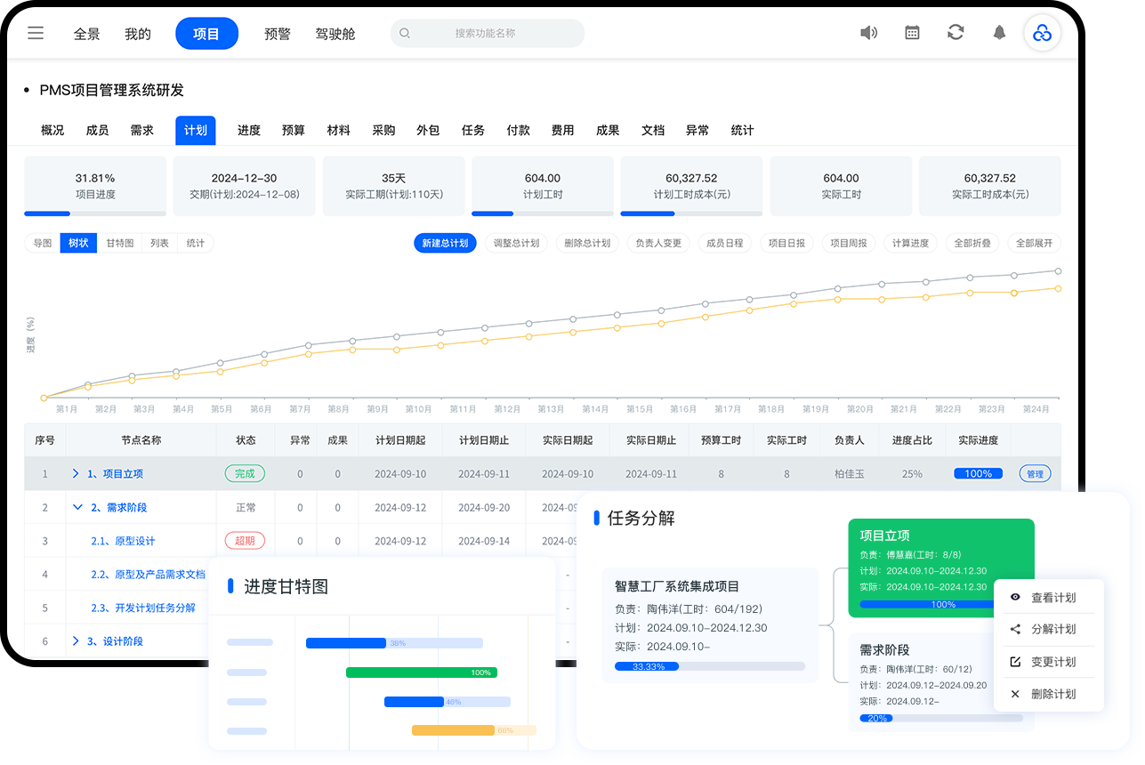 以计划控进度;项目里程碑计划支持WBS任务拆分及汇报,自动生成计划看板,项目进度一目了然。一键生成进度甘特图,智能预警进度滞后或超期。