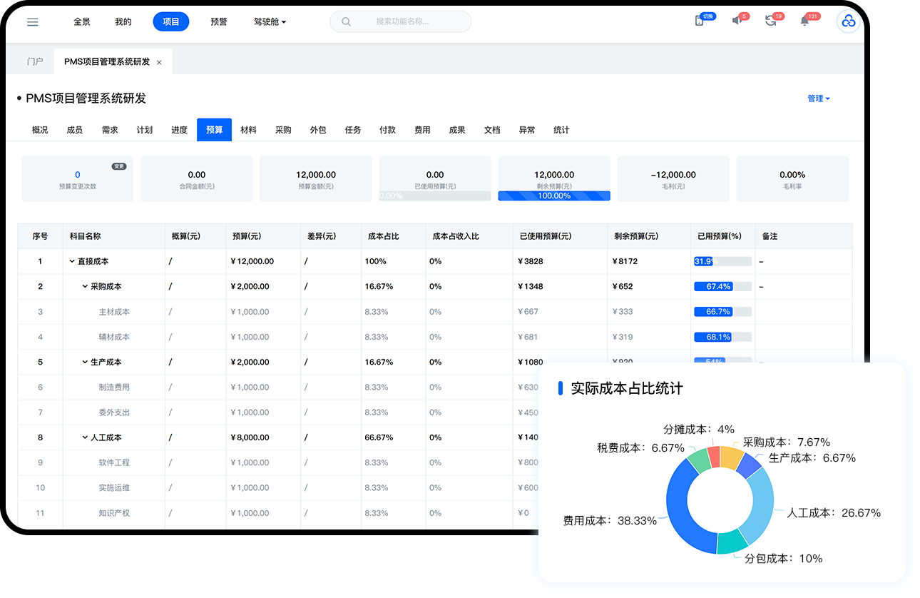 以预算控成本;可视化管控研发项⽬⼈、材、费、分包预算的编制、变更、分析全过程。自动监控预算使用情况,超支自动预警。