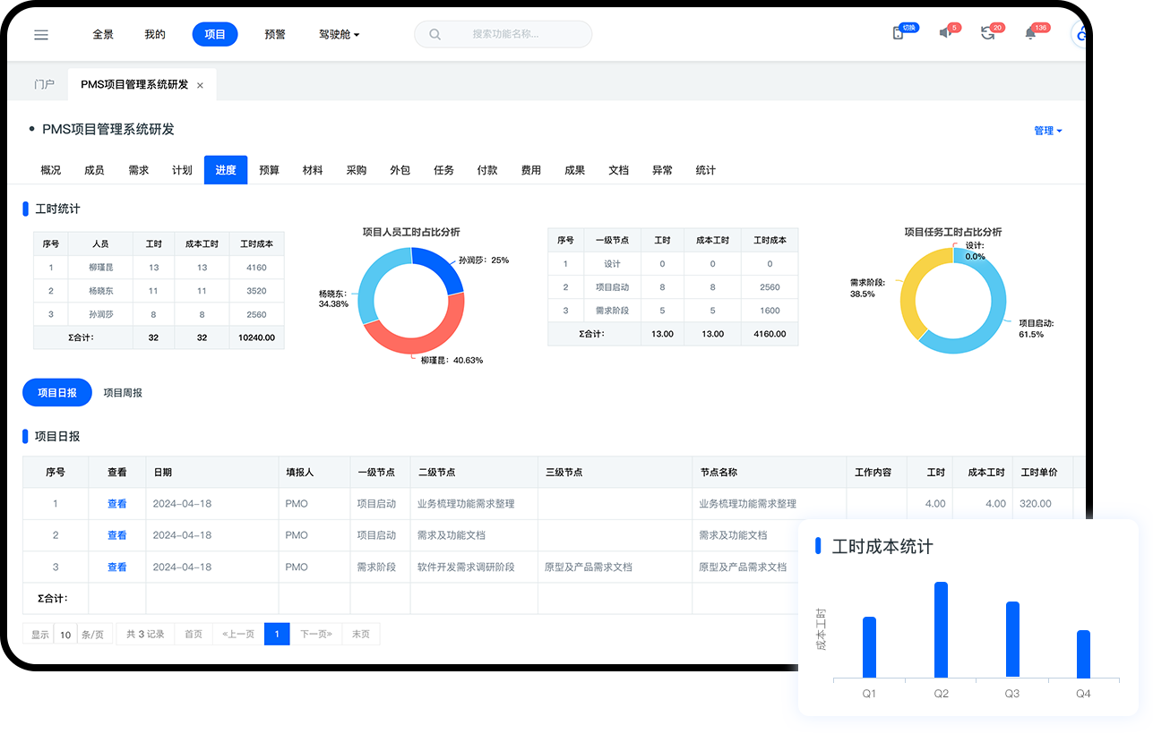 通过项目成员日报、任务汇报,自动更新项目实际进度,自动生成项目工时统计、工时成本统计等可视化图表。
