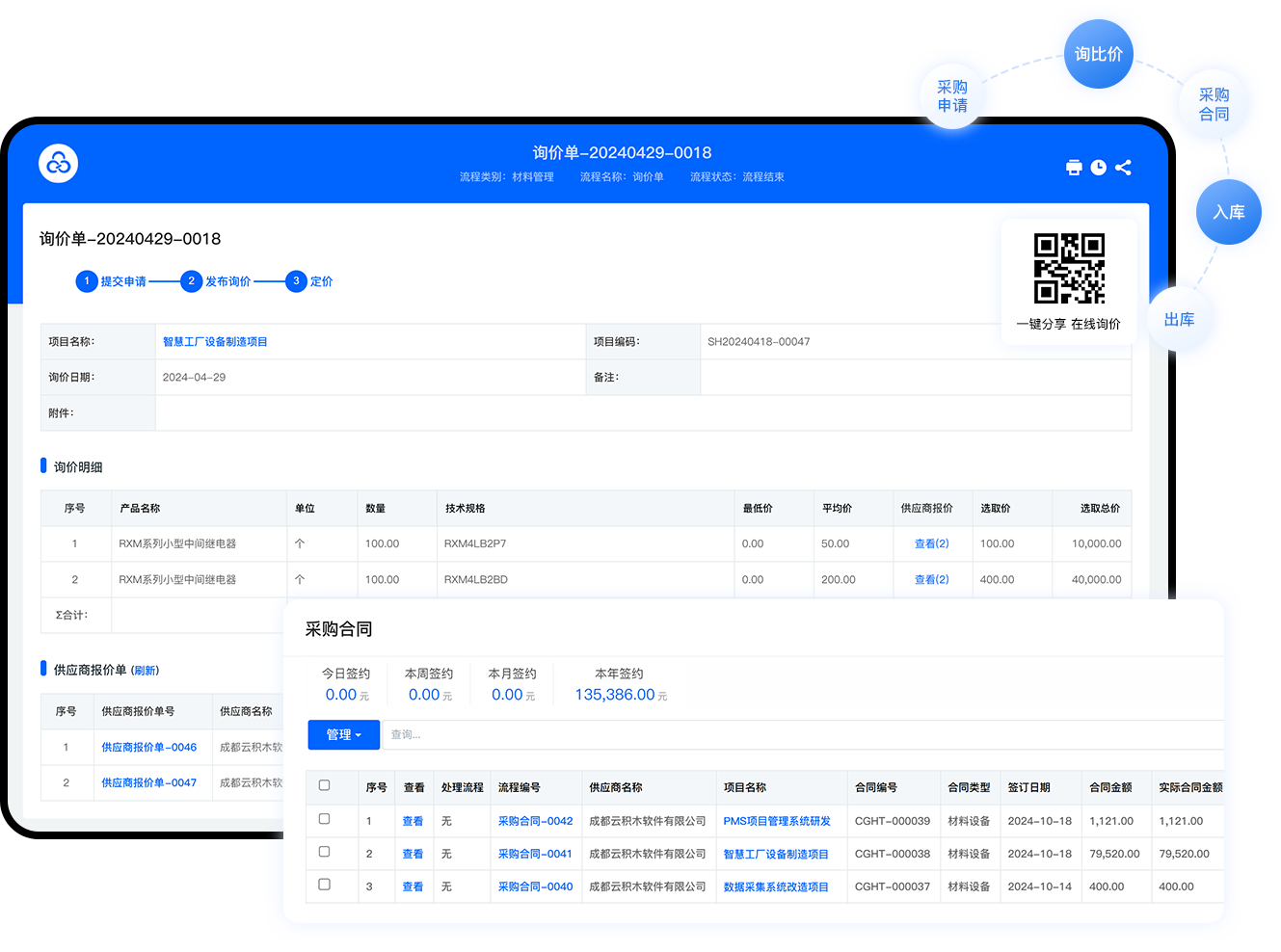 覆盖采购申请、MRP分析、询比价、采购合同、原料入库出库、供应商管理全链条;自动生成询价二维码,支持多家供应商在线报价、系统自动比价。
