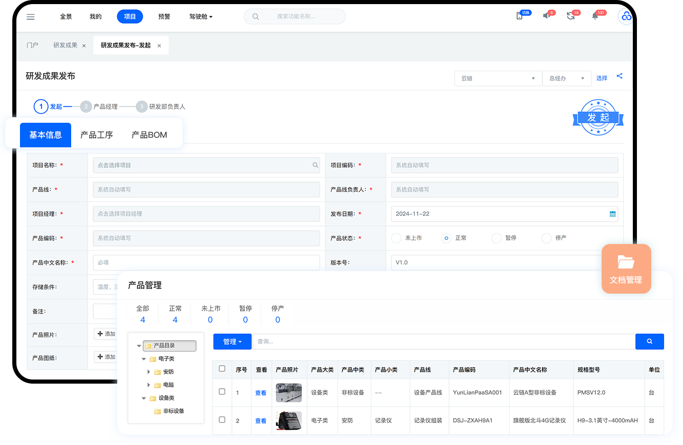 研发成果提交、审核、发布全流程可视化,自动同步成果BOM表及工序数据至产品库,自动归档研发文件至项目文档,实现数据信息在线共享。