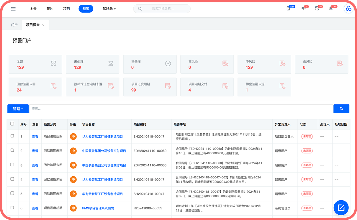 直观呈现所有项目风险及处理状态,自动追踪项目全过程风险,自动提醒相关责任人。支持自定义设置提醒规则。
