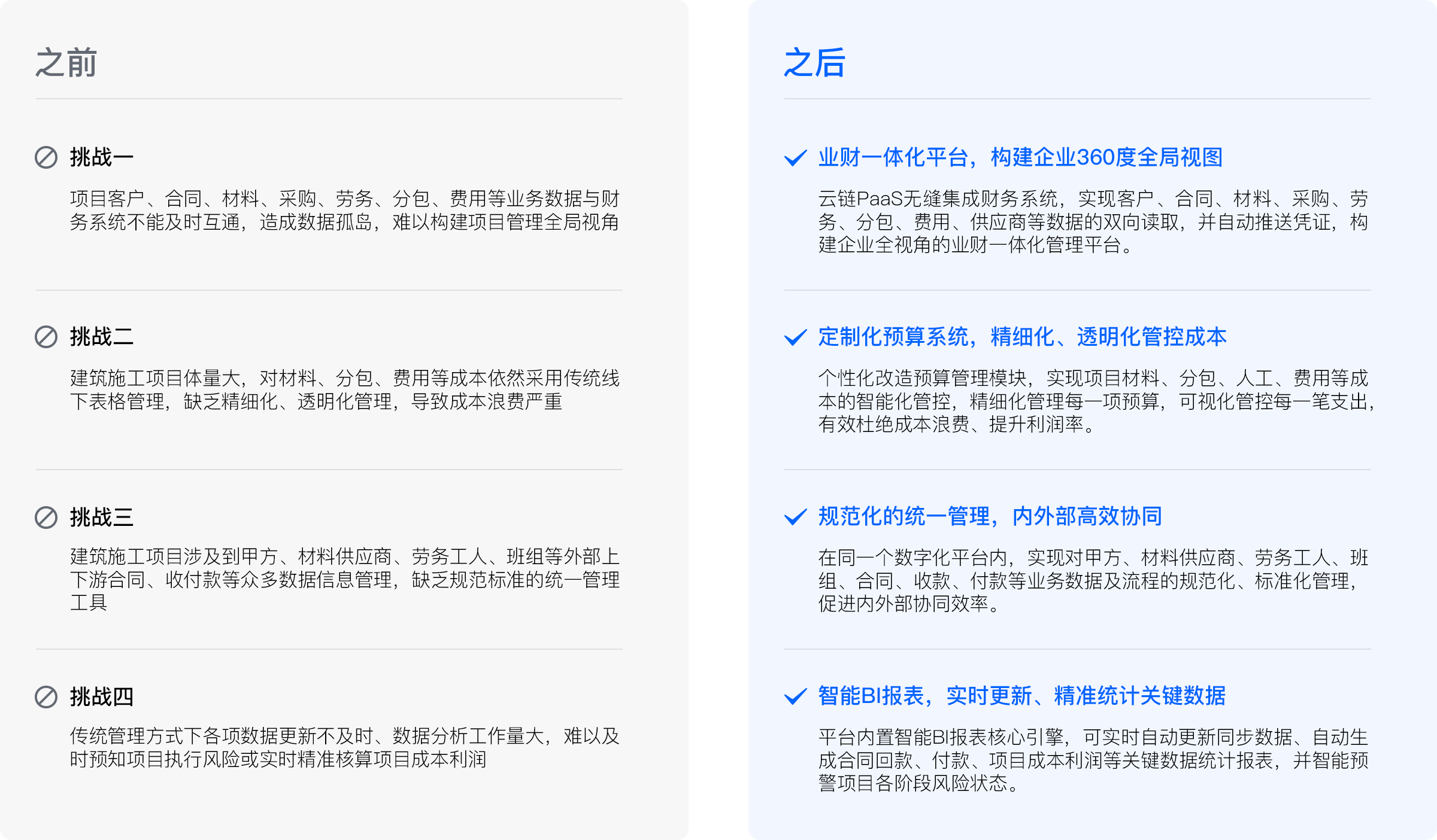 云链团队为秦恒建设科技有限公司(以下简称“秦恒建设”)设计打造的建筑施工项目全周期管理系统,是典型的业财一体化管理平台。在需求调研阶段已明确云链作为业务系统,需包含项目售前客户及商机、投标、合同、收款等,项目中期合同执行、材料、采购、分包、劳务、联合施工、产值、供应商、付款等,项目后期结算、统计等,以及全过程风险预警、流程审批等项目360度可视化管控功能,同时完全承接与其正在使用的财务系统(用友)集成开发工作。云链团队根据需求调研成果,设计完善系统架构并成功落地实施,实现业财一体化平台构建。