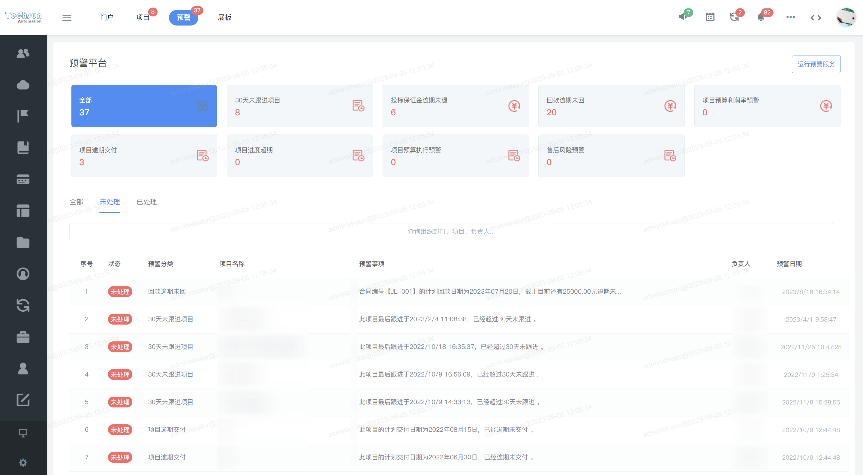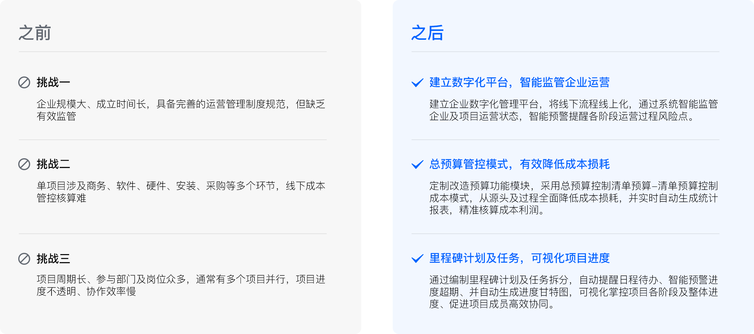 通过建立企业数字化管理平台,将线下流程线上化,系统智能监管企业及项目运营状态。无论是各部门日常协同效率、项目实施交付进度,还是企业报销费控、项目人工、材料、采购等成本支出上,都能够做到可视化、智能化管理。同时,系统可智能预警提醒企业及项目各阶段运营风险,助力提升企业整体管理水平。