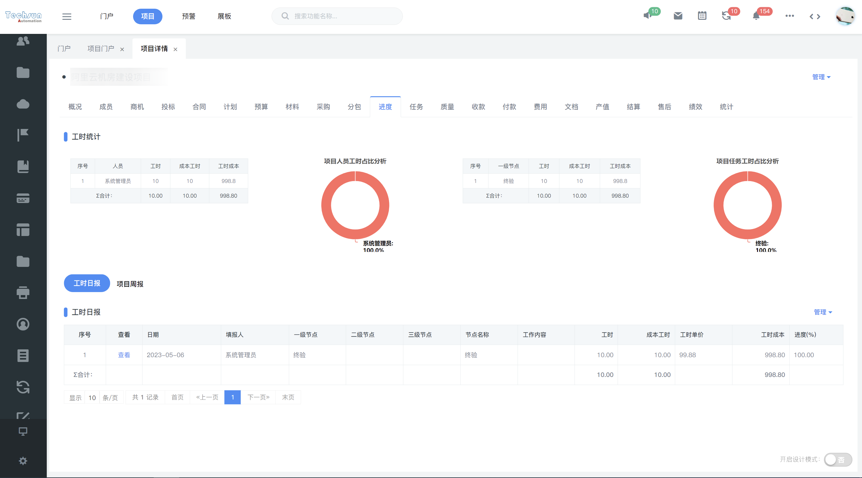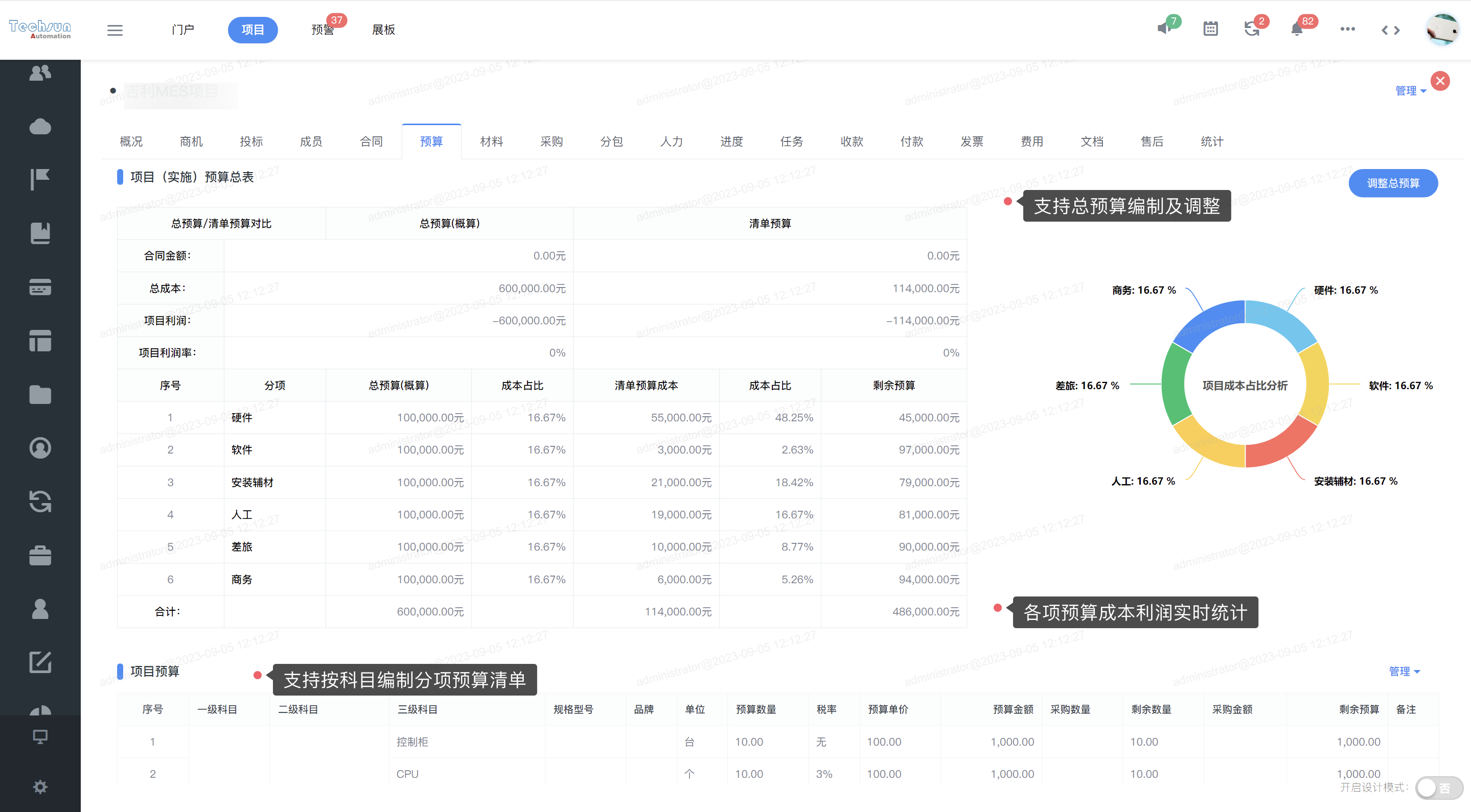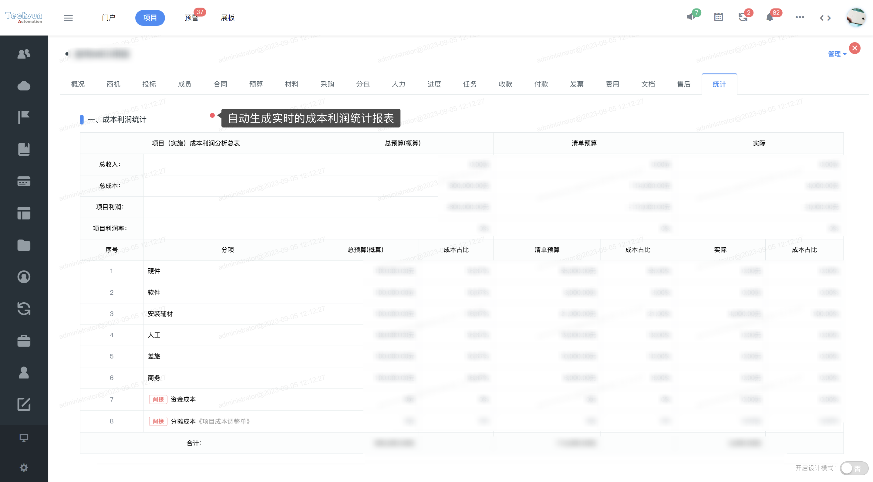 根据深圳天圳项目特点,云链团队提供个性化定制改造方案,尤其针对系统预算功能模块,采用总预算控制清单预算-清单预算控制成本的模式。由项目经理编制总预算,项目成员在总预算范围内编制清单预算。包含“硬件、软件、安装辅材、人工、差旅、商务”几大类型预算,通过预算智能监管预警各项成本支出全过程,从源头及执行过程全面降低成本损耗,并实时自动生成统计报表,精准核算成本利润。