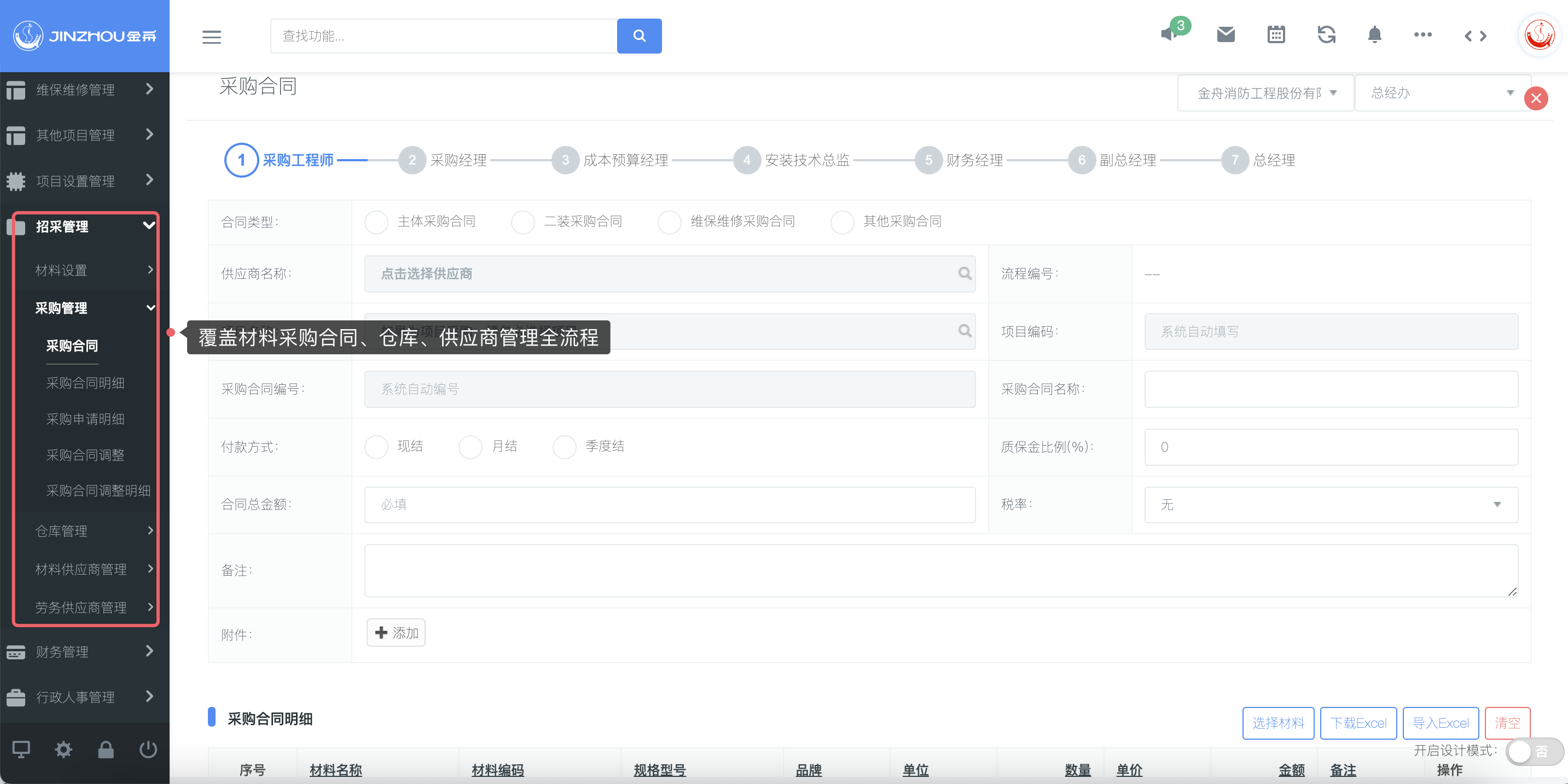 建立预算智能控制材料采购系统流程,覆盖预算编制、采购申请、供应商入库申请、采购合同签约、材料入库、领料出库等全过程,让招采全流程智能化、可视化、规范化。