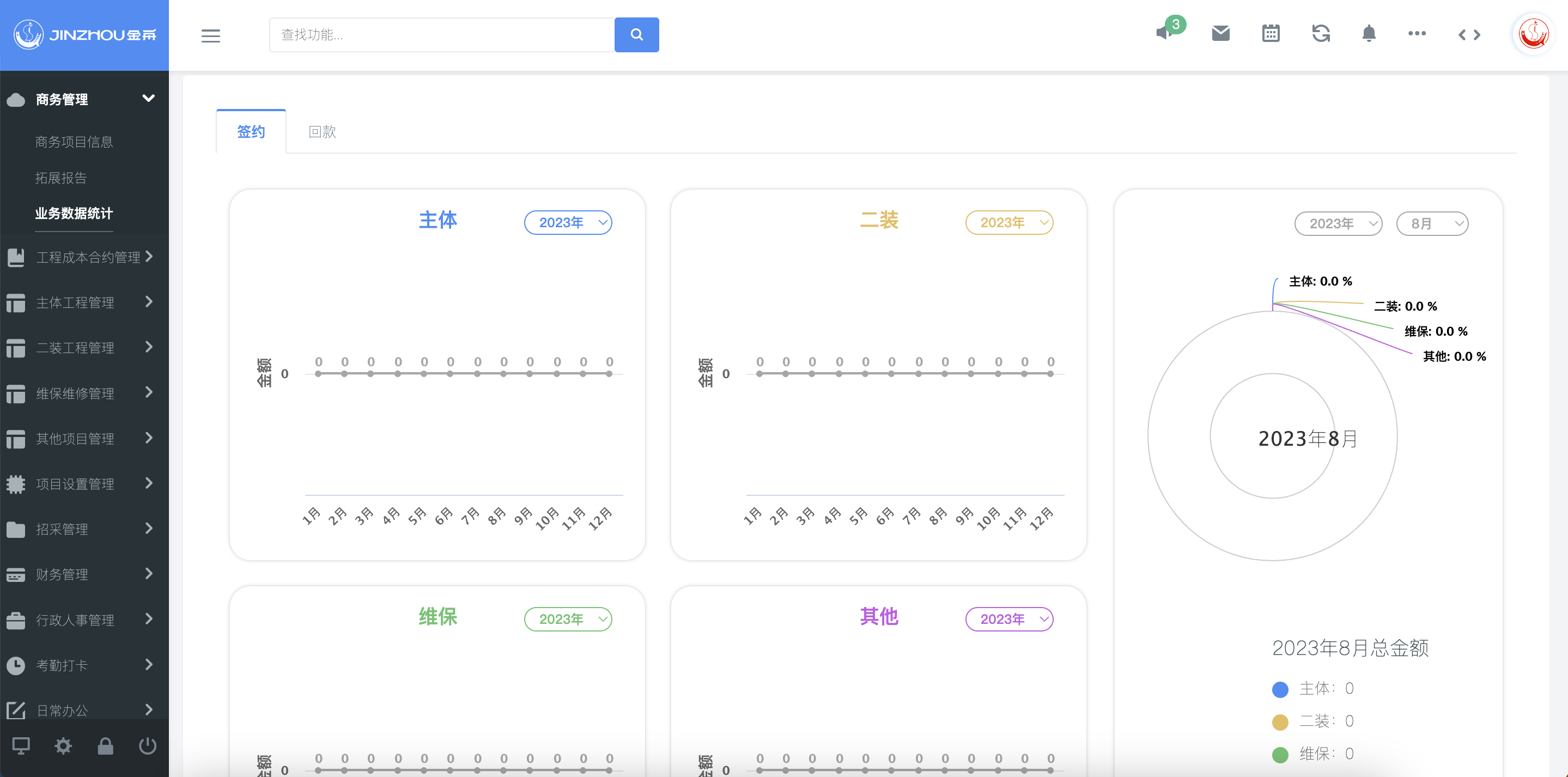 针对金舟消防商务数字化管理需求,建立统一的商务信息管理功能,包含商务客户基础信息、拓展报告等数据电子化,以及实时自动更新的业绩统计报表功能。