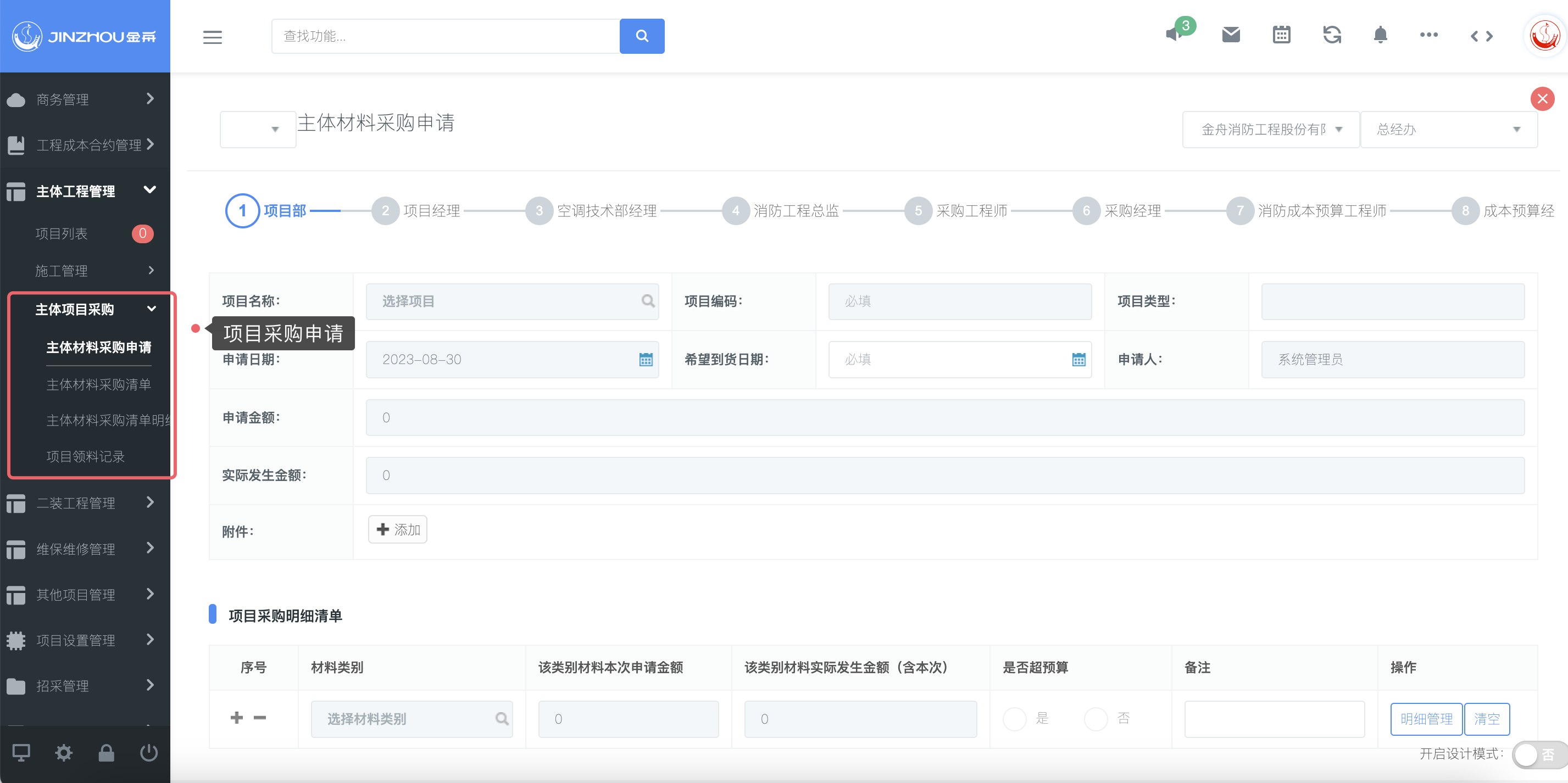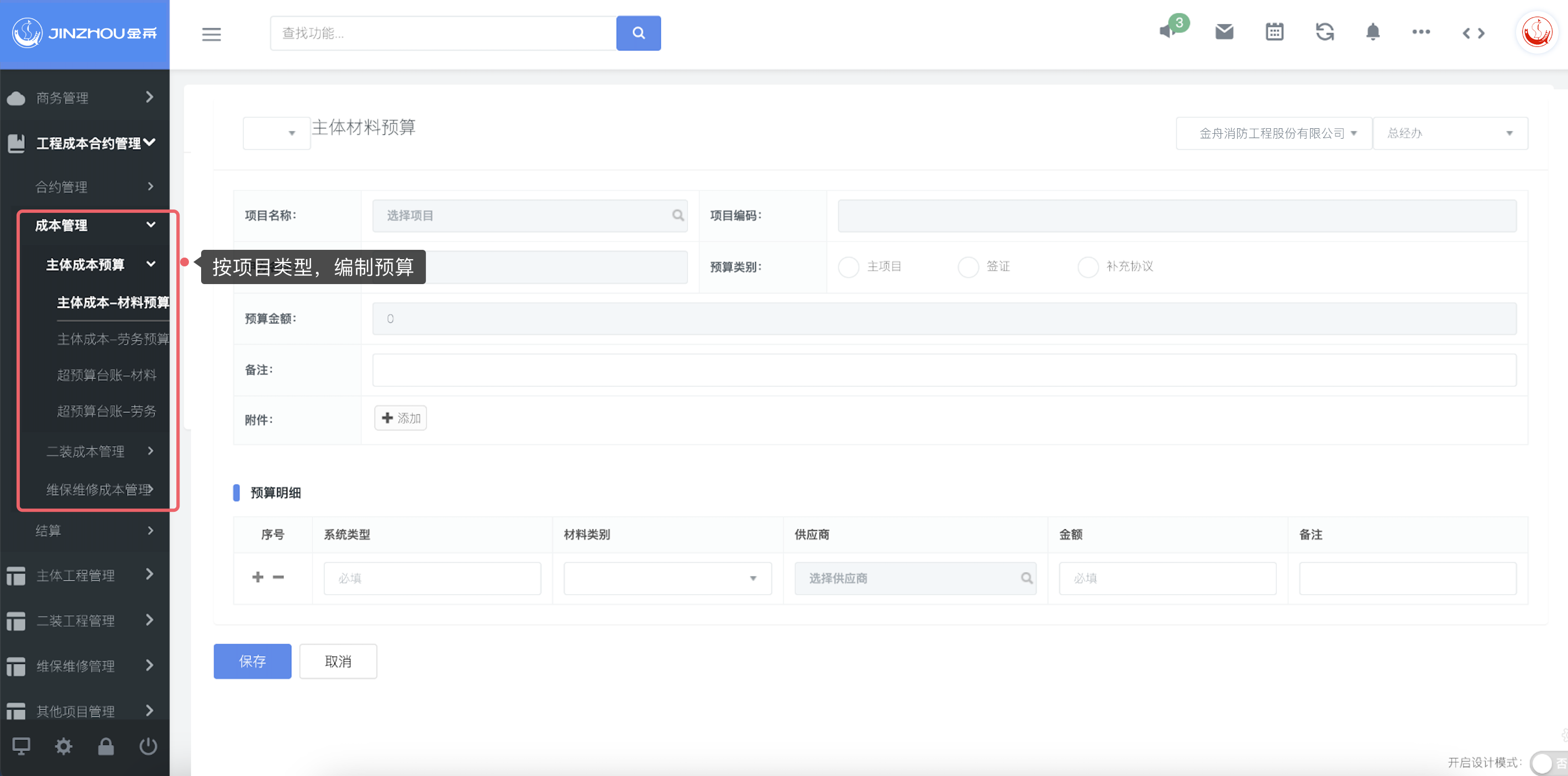 消防项目管理系统主要包含前期商务及合约管理、中期预算成本及采购等管理、后期结算及统计等全周期管理功能。根据金舟消防具体管控需求,云链PaaS团队以“主体工程管理、二装工程管理、维保维修管理”三大项目类型业务流程为主线,设计金舟消防消防项目管理系统架构,以实现项目全周期数字化、精细化管控。